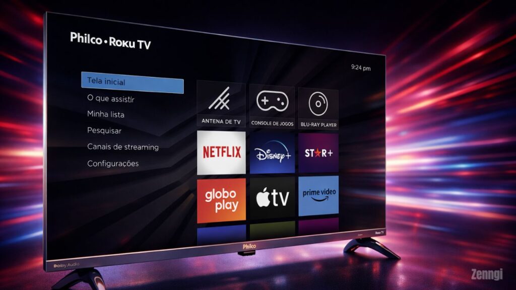 A escolha do Roku TV não é por acaso. A plataforma se consolidou justamente por oferecer uma interface simples, direta e extremamente intuitiva. Diferente de sistemas que priorizam excesso de animações ou camadas complexas de menus, o Roku aposta em uma estrutura objetiva, com grade de aplicativos organizada na tela inicial e acesso rápido às configurações principais. Para o público leigo, isso representa menos frustração e curva de aprendizado quase inexistente.